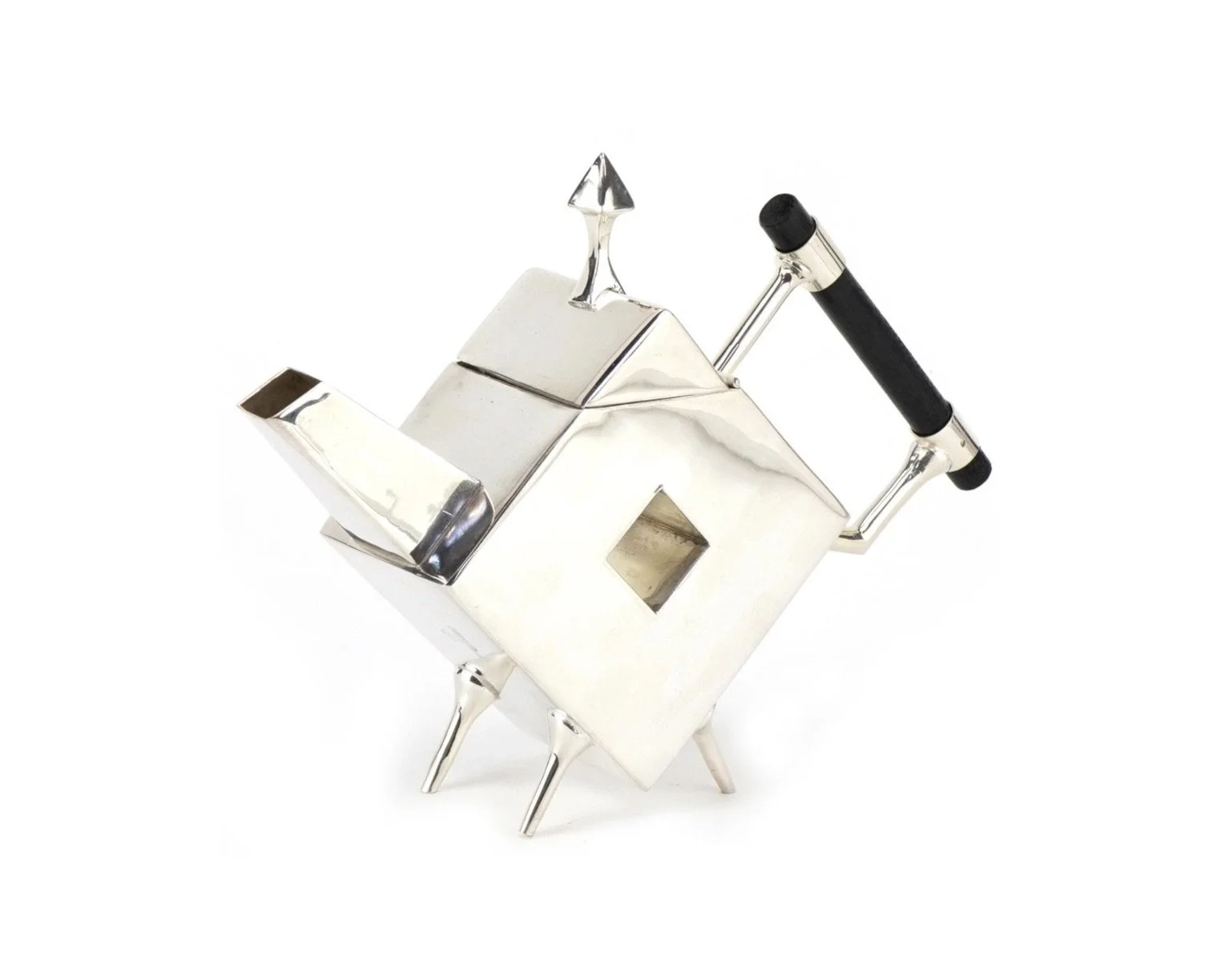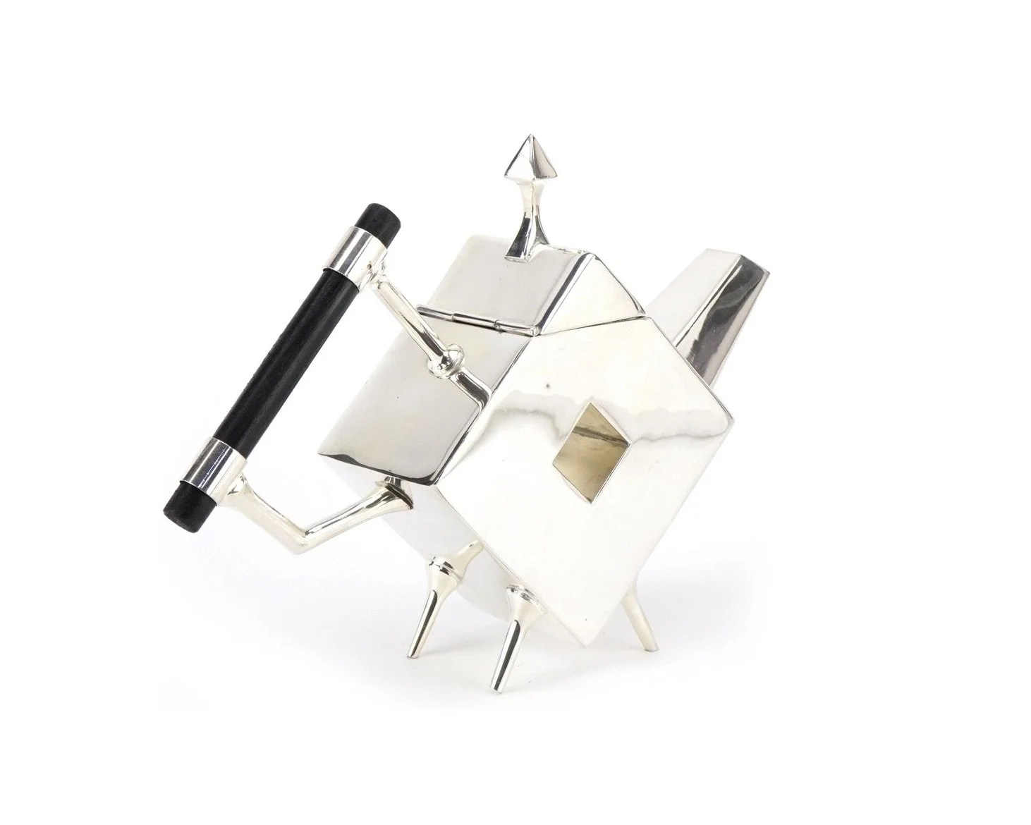 A 20th Century Art Deco style silver plate teapot designed by Christopher Dresser in 1879, the diamond form with a central aperture, angular black ebonised wood handle, all raised on four stylised legs.